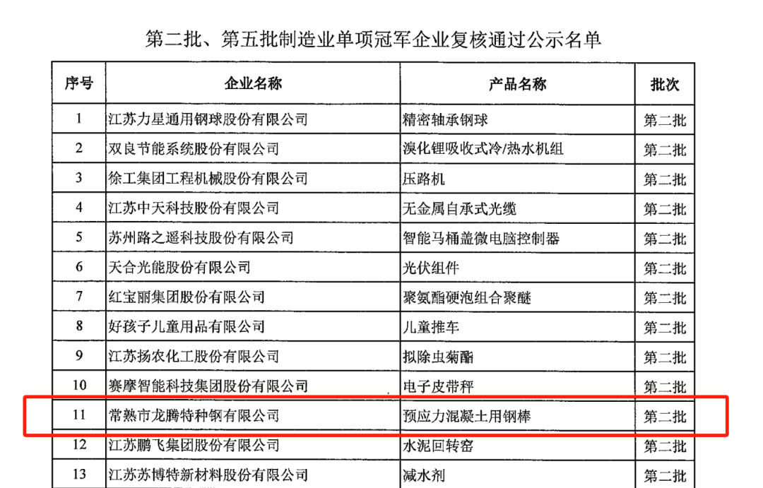 近日,工信部公布通過(guò)復(fù)核的第二批、第五批制造業(yè)單項(xiàng)冠軍企業(yè)名單,常熟市龍騰特種鋼有限公司生產(chǎn)的預(yù)應(yīng)力混凝土用鋼棒和常熟市龍?zhí)啬湍デ蛴邢薰旧a(chǎn)的研磨機(jī)用研磨鋼球再次攜手登上“冠軍寶座”。